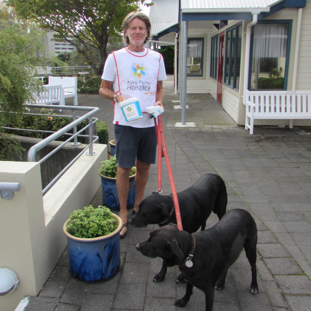 When Bruce hits the streets to collect for Mary Potter Hospice, his canine companions often tag along.