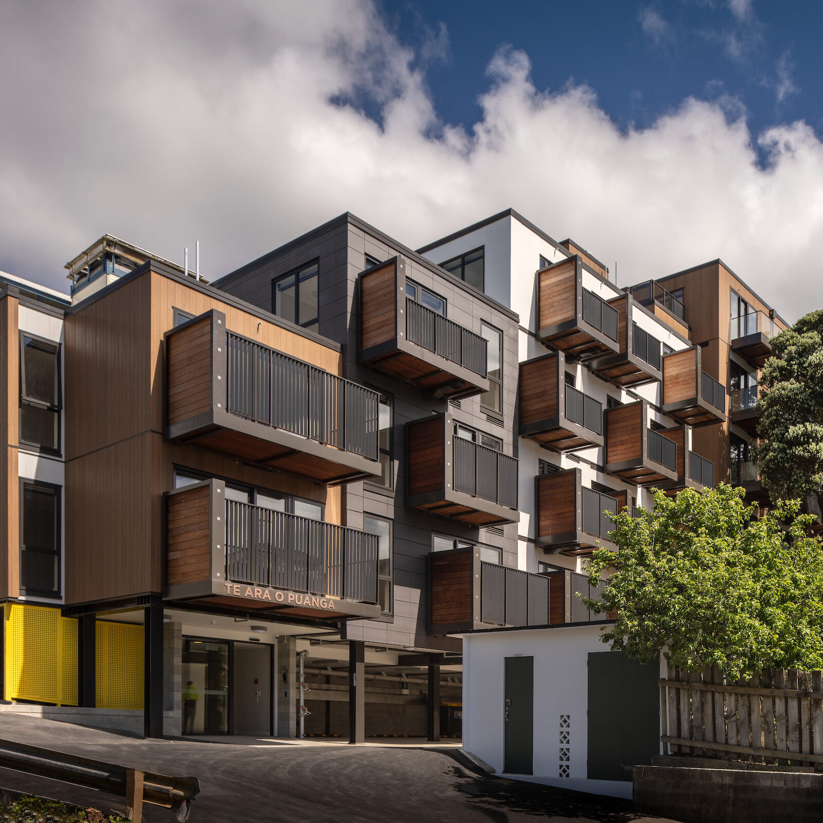 The name Te Ara o Puanga means the pathway of Puanga, which is the star that hails the season of Matariki. Designed by Archaus architect Huw Parslow, the apartment building is tucked behind the existing Mary Potter Hospice Inpatient Unit facility on a small and steep site, and is predominantly constructed of prefabricated engineered timber walls and mass-produced timber floor panels, all manufactured off-site and craned into place.